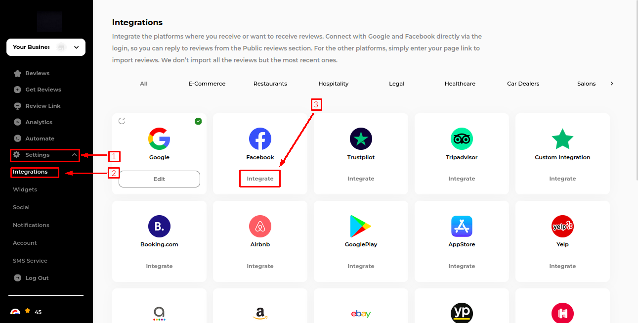- Easily integrate with over twenty different review platforms by clicking the "Integrate" button next to each platform.