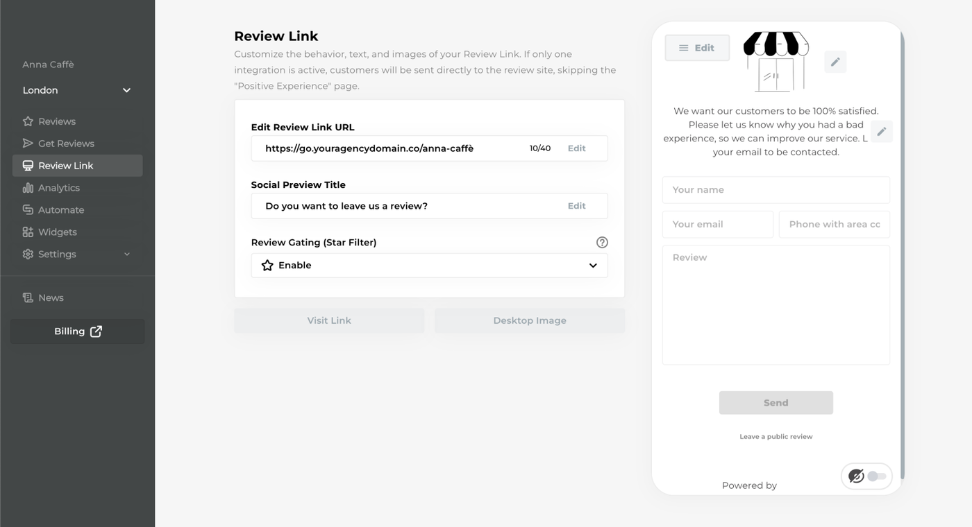 - You can choose to disable the display of the Negative Feedback page by clicking Review Link and selecting "Star filter disabled."