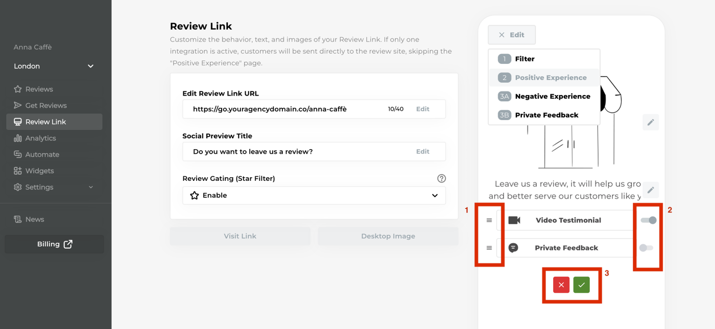 Click the pencil icon to enable or disable platforms to display on the Review Link under the Positive Experience section. You can also drag the platforms up or down to arrange them in order of importance.
