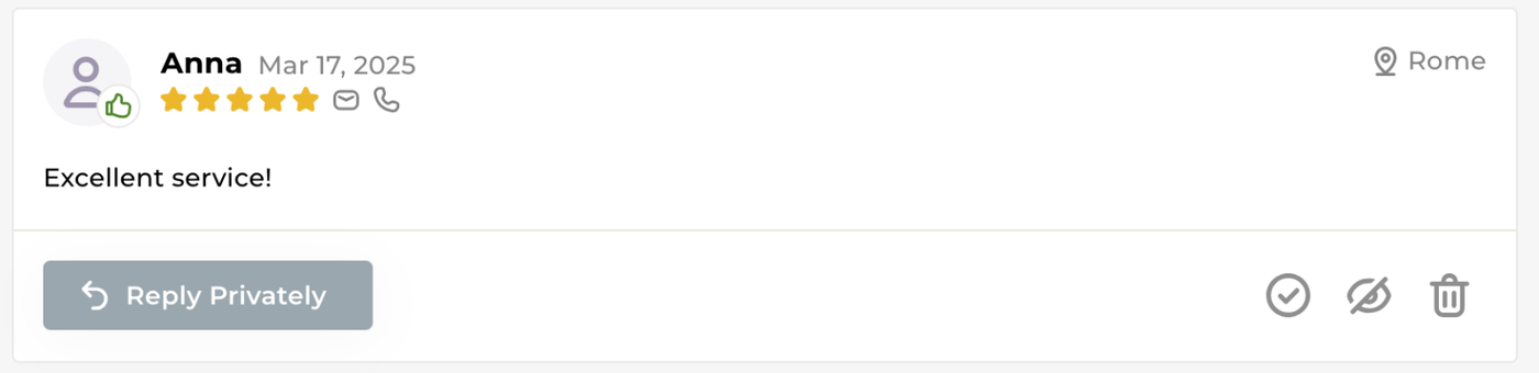 Private Feedback In Private Feedback, customers who rate 4 to 5 stars can leave private feedback by filling out a form and clicking "Send." These reviews won't be made public. At the moment, you can only edit your logo and the introduction line. Sample private feedback.