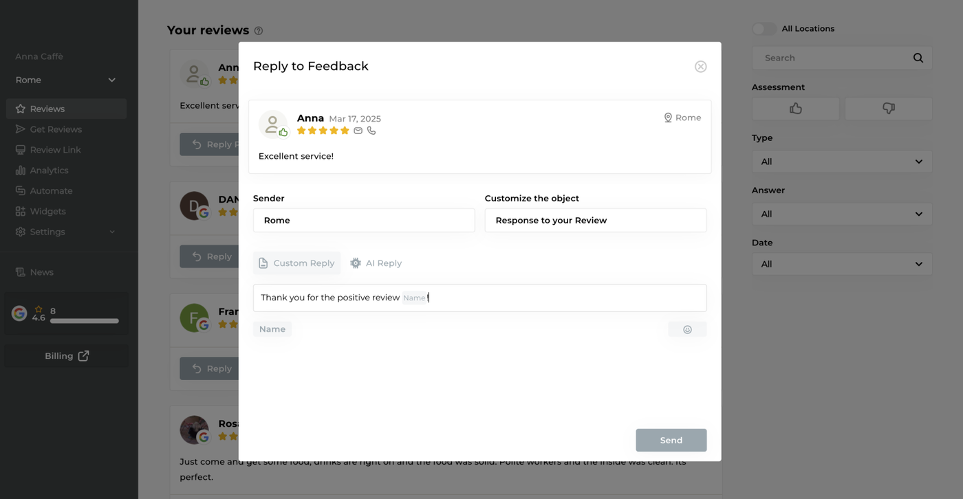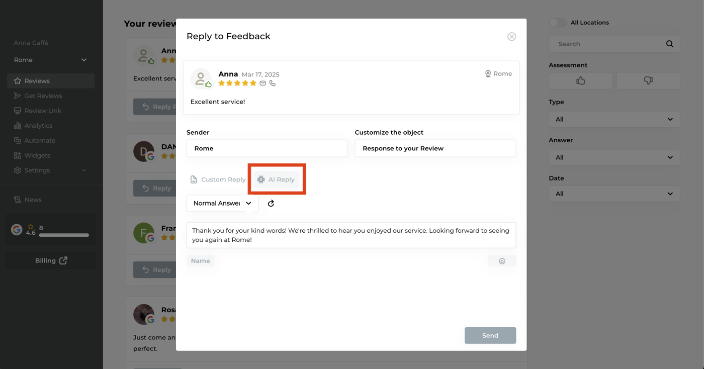 - In addition to crafting your responses manually, leverage our AI Reply feature.